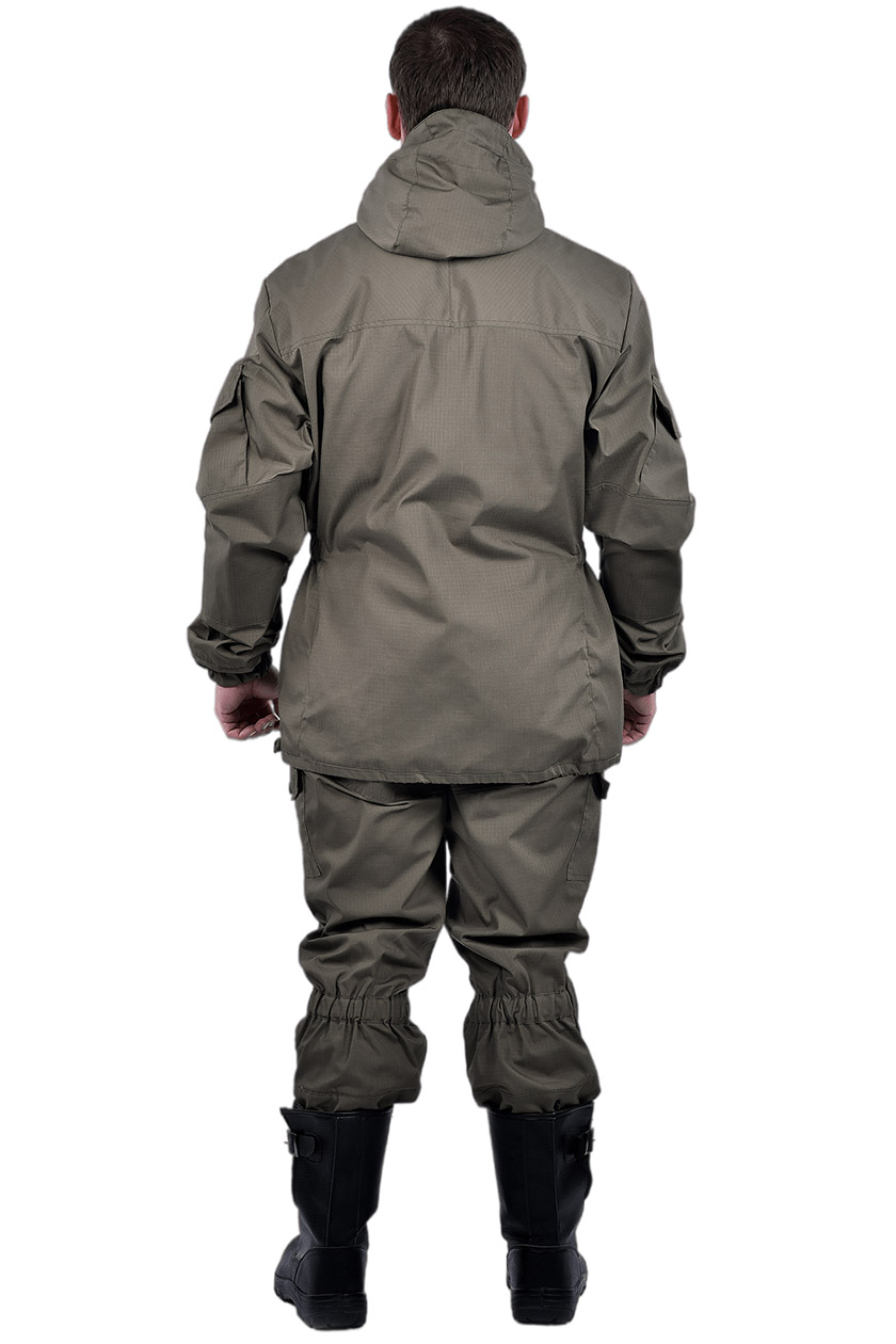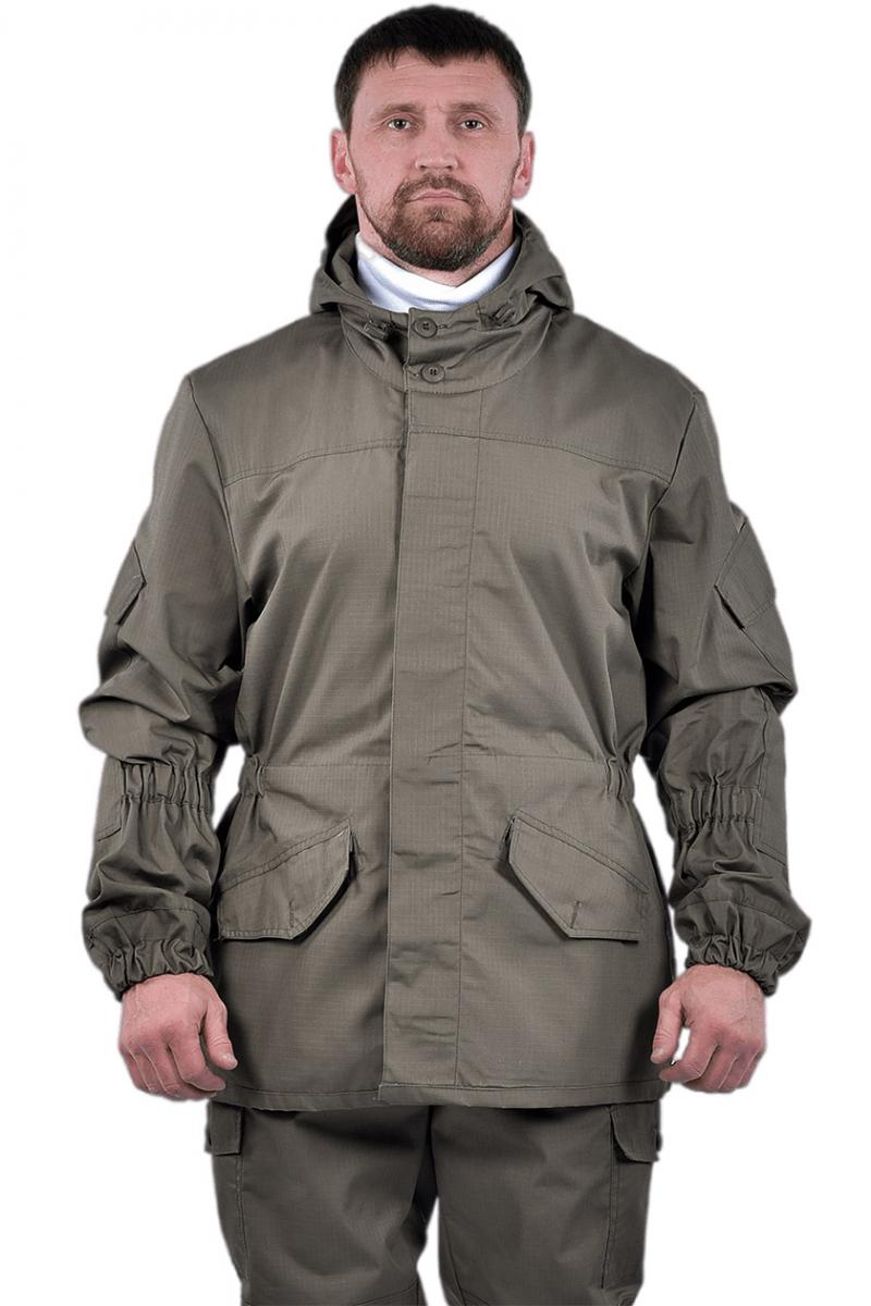 ➠ Куртка: крой прямой, супатая бортовая застежка на пуговицах. На полочках наклонные прорезные карманы с клапаном застегиваются на пуговицы. По линии талии расположена кулиса собранные на эластичную ленту. На рукавах накладные карманы с клапанами фиксирующиеся на контактную ленту, с манжетами. Области локтей усилены налокотниками. Внутренний карман на подкладке левой полочки.