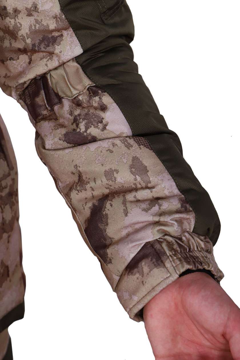 По линии талии находится кулиса. Капюшон регулируется кулисами и фиксатором. Рукава с фигурными налокотниками и трикотажными манжетами, по линии локтя кулиса,выше расположены накладные карманы с фигурными клапанами. По низу куртки, для регулировки объема, предусмотрена кулиса.