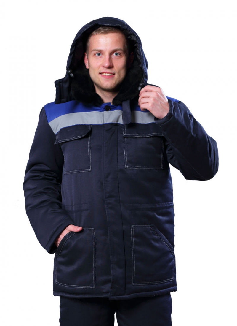 ➠ Куртка утеплённая прямого кроя, с центральной супатной застежкой на пуговицы. Отложной воротник из искусственного меха, съемный капюшон. Хлястик по воротнику застегивается на пуговицу. Рукава с внутренними трикотажными манжетами. СОП расположен по швам притачивания кокеток.