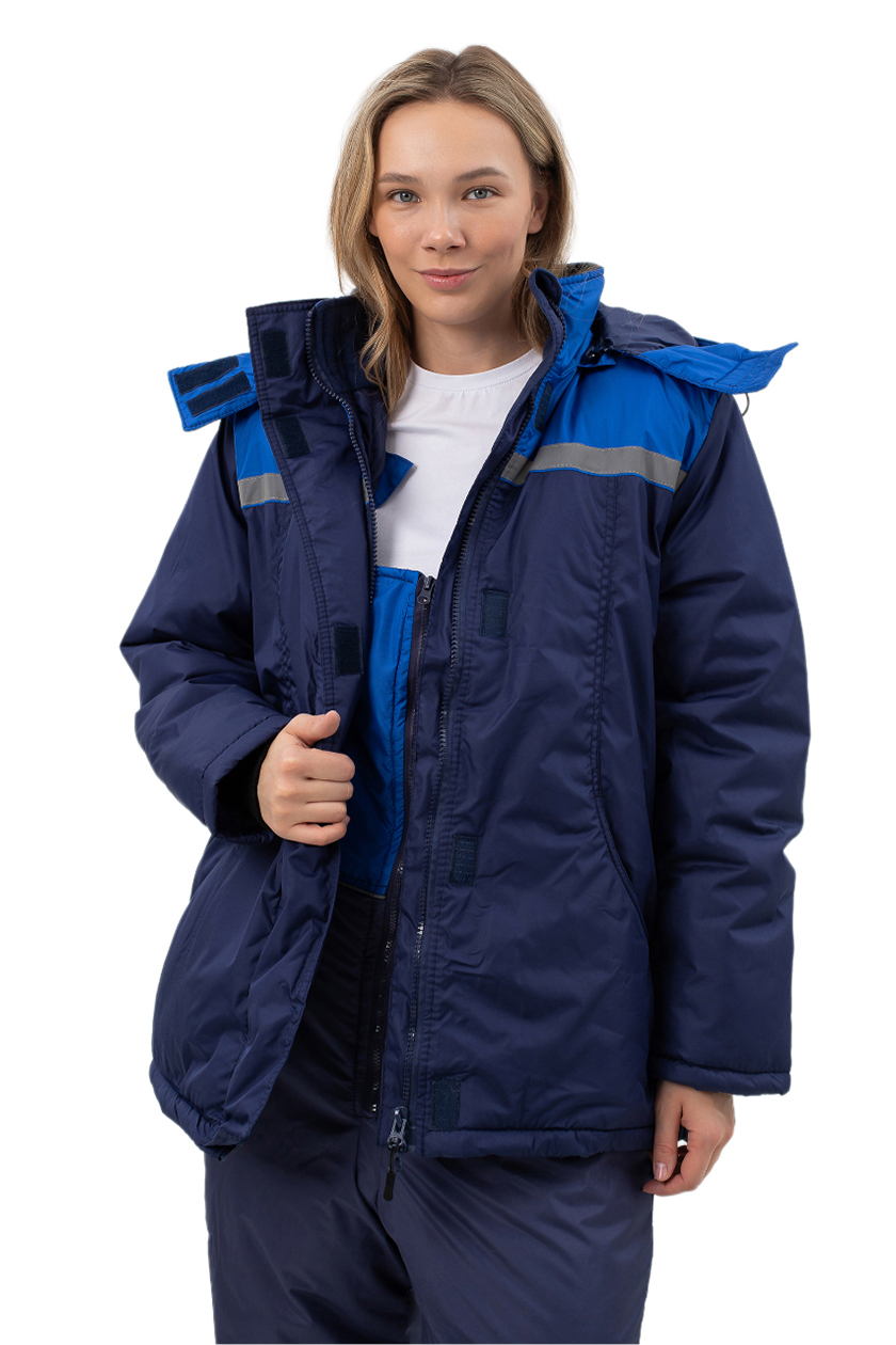 Куртка утепленная с центральной застежкой на тесьму «молния» и внешним ветрозащитным клапаном, застегивающимся на липучку. Воротник стойка с флисом. Полочки с боковыми нижними карманами в рельефных швах сложной конфигурации. Внутренний карман. Рукава с трикотажными манжетами. Внизу куртки кулиса. СВ кант расположен в швах притачивания кокеток.